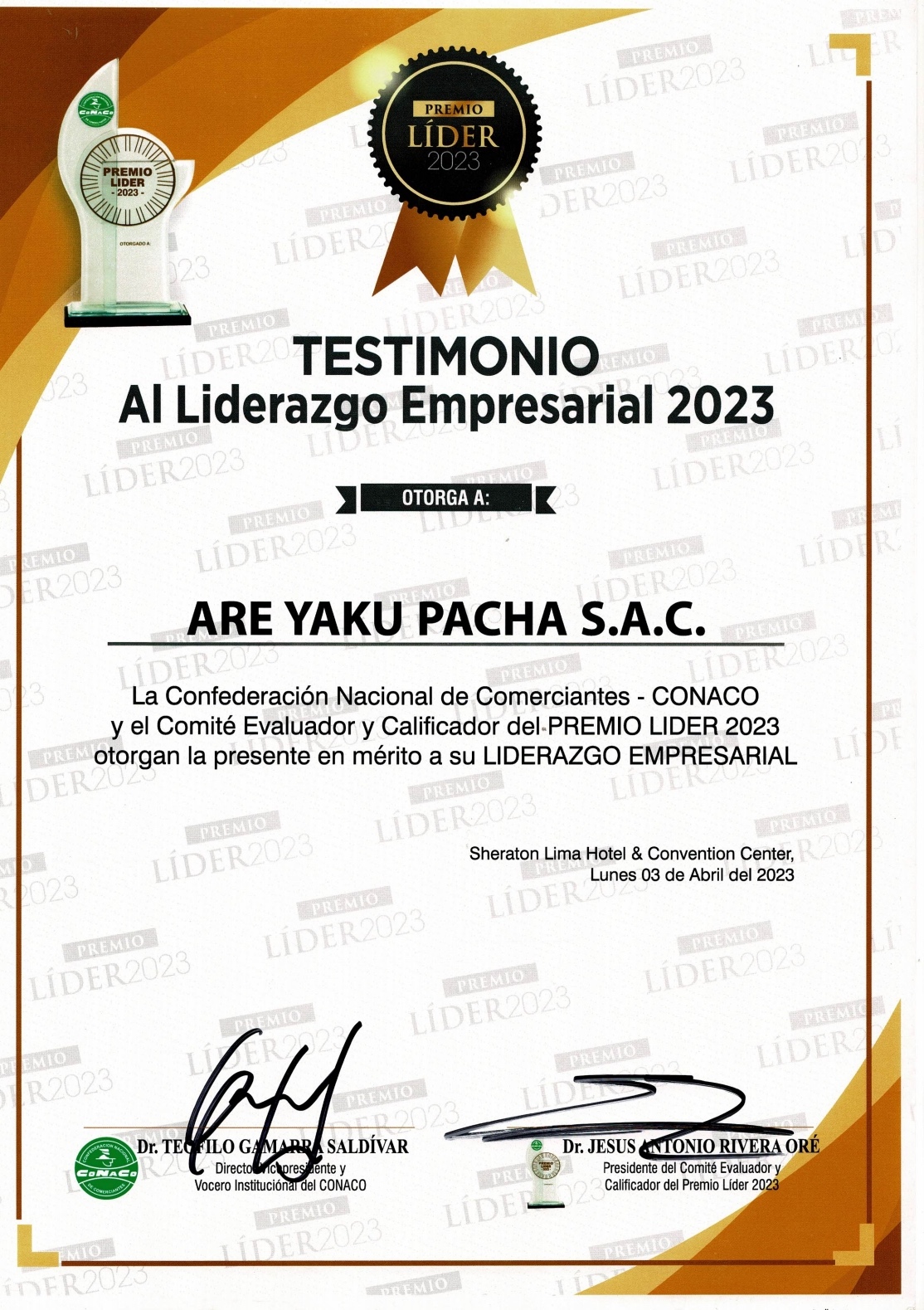 CONACO y el comité Evaluador y Calificador del PREMIO LIDER 2023 otorgan la presente en mérito a su LIDERAZGO EMPRESARIAL.